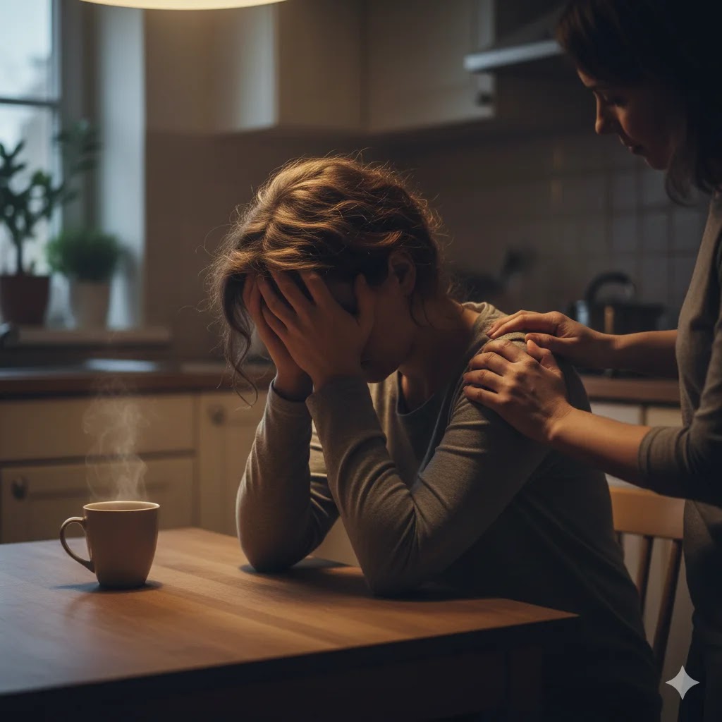 An exhausted caregiver receiving comfort and support from a friend at a kitchen table.