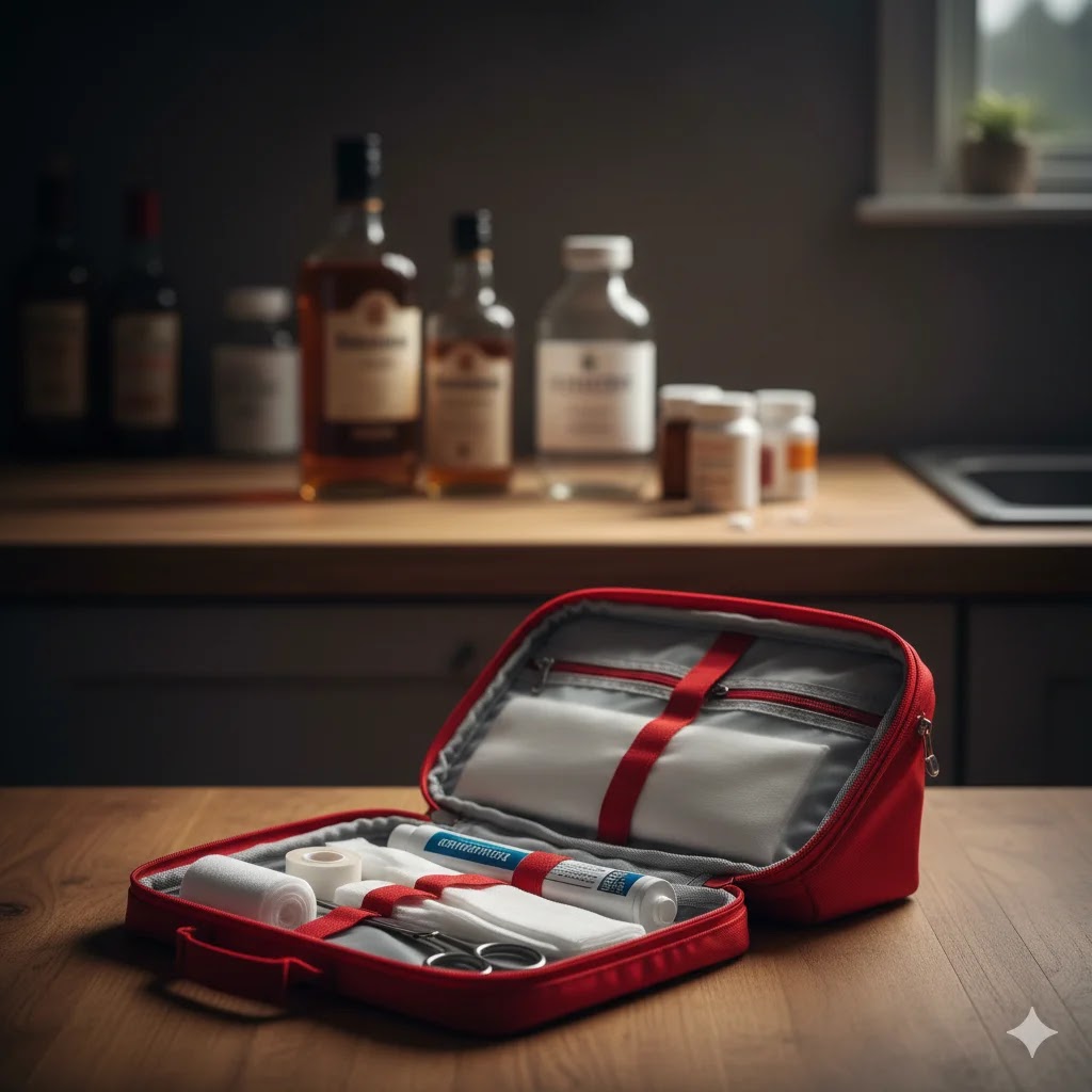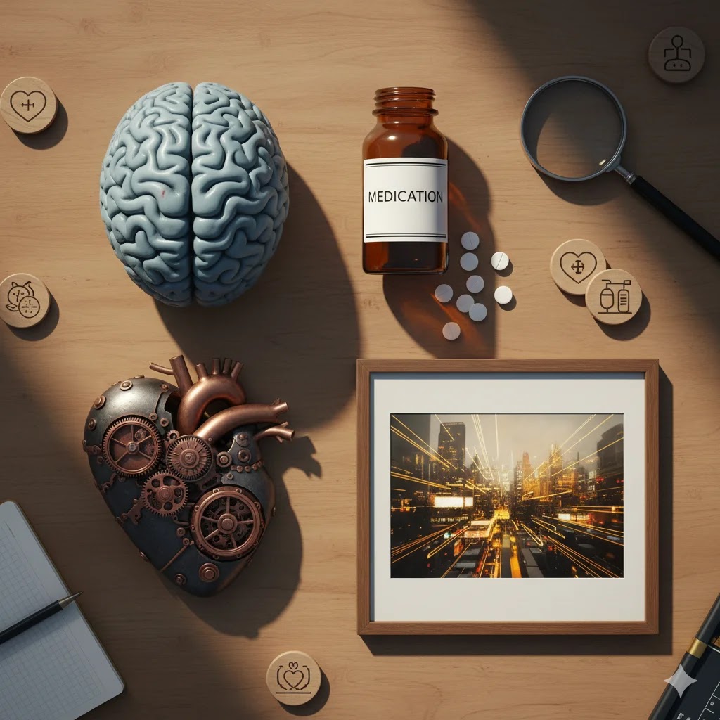 An overhead flat lay of objects symbolizing the multifaceted causes of agitation: a brain model, medication, a heart icon, and an urban scene