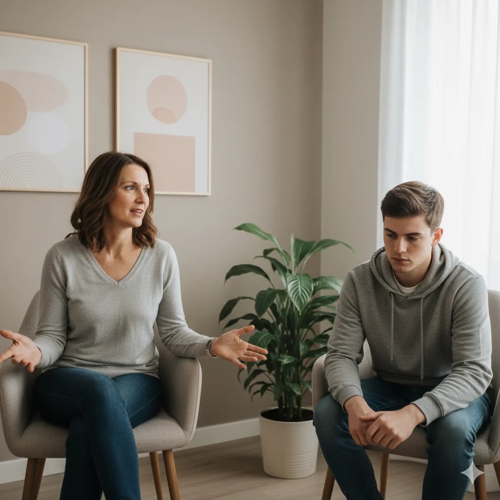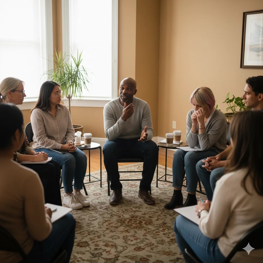 A diverse group of adults participating in a supportive group therapy session in a community room. Agitation causes symptoms and management