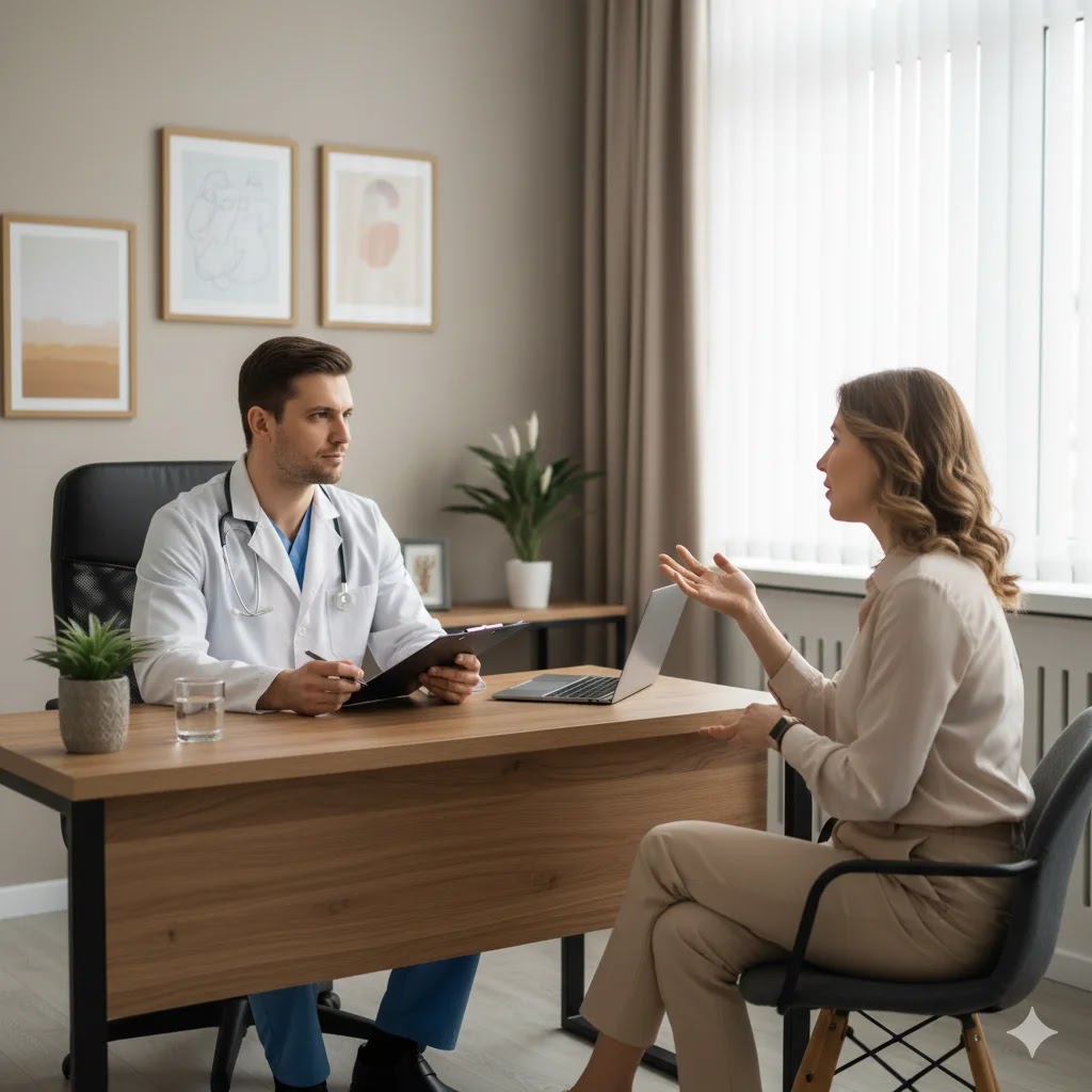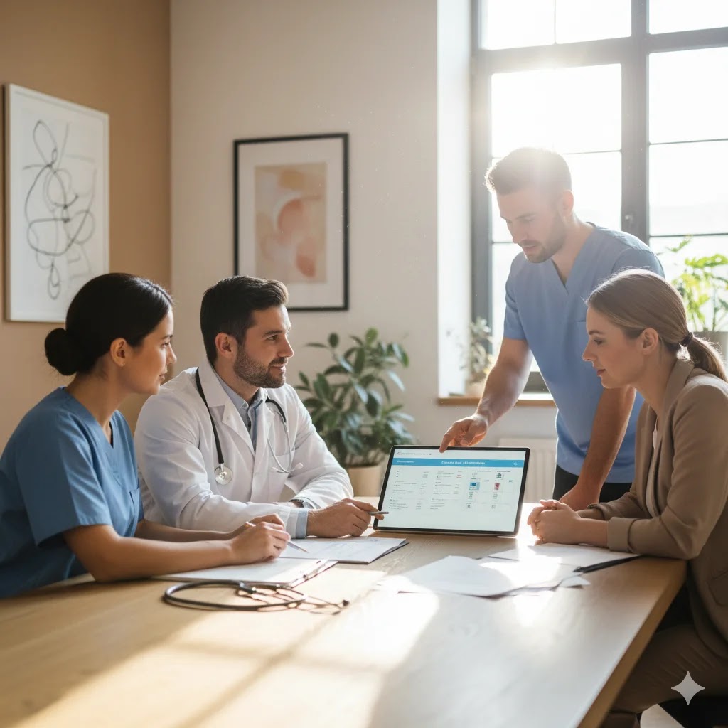 A multidisciplinary healthcare team collaborating over a patient's care plan in a clinical setting.