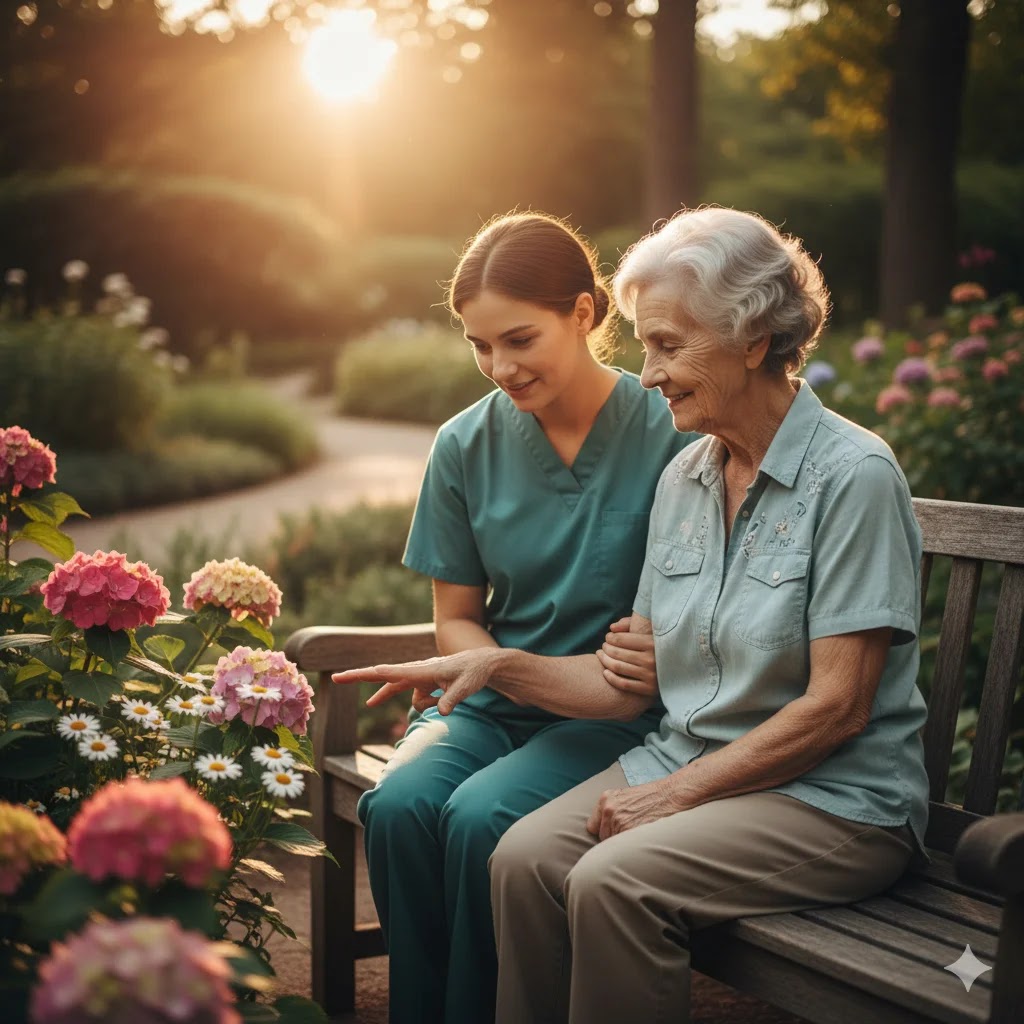 A caregiver engaging calmly with an elderly woman with dementia on a park bench during sunset.