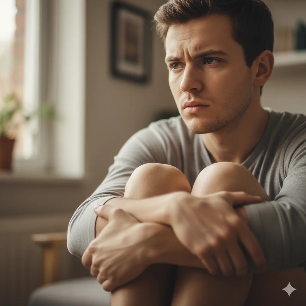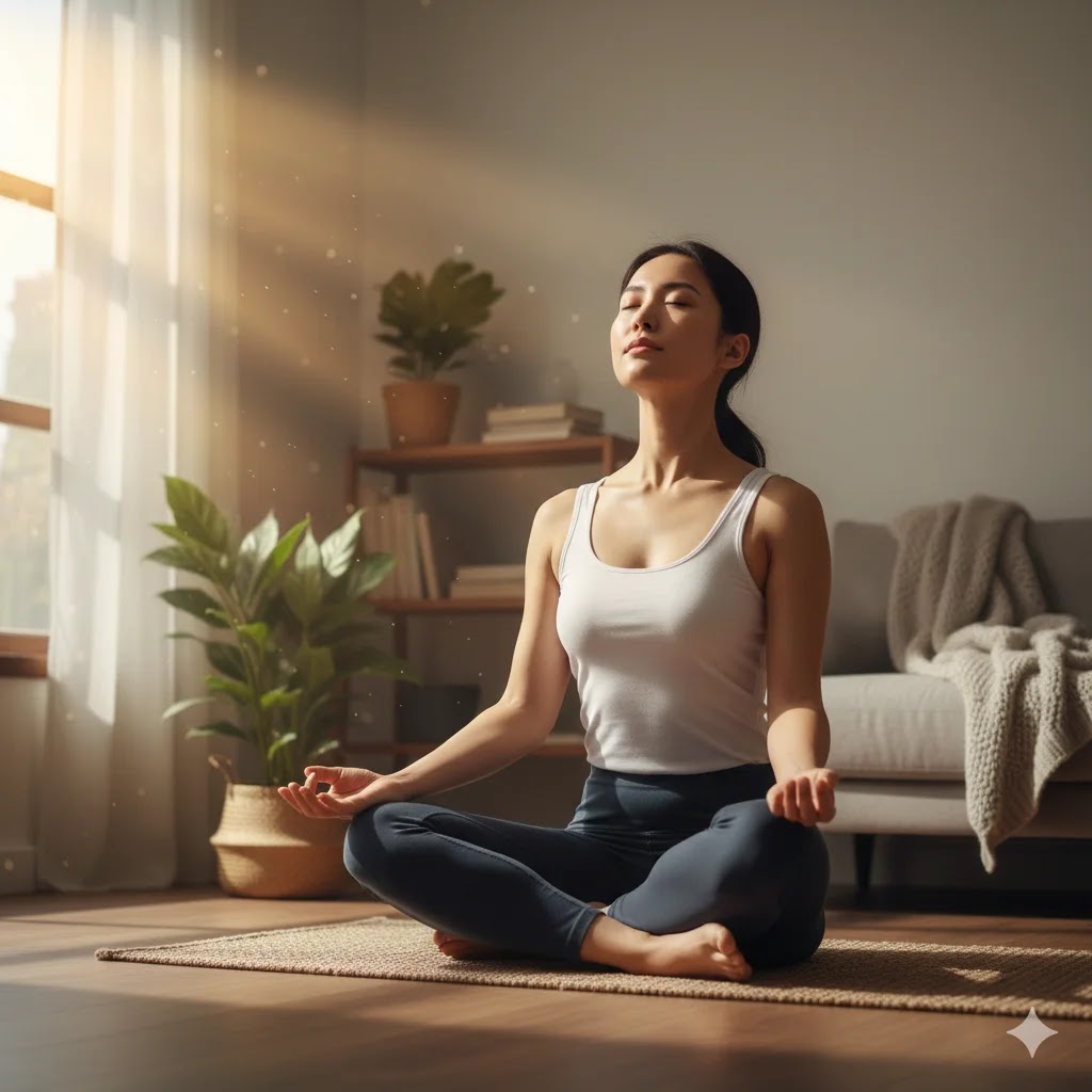 An adult practicing deep breathing exercises for stress management in a sunlit living room.