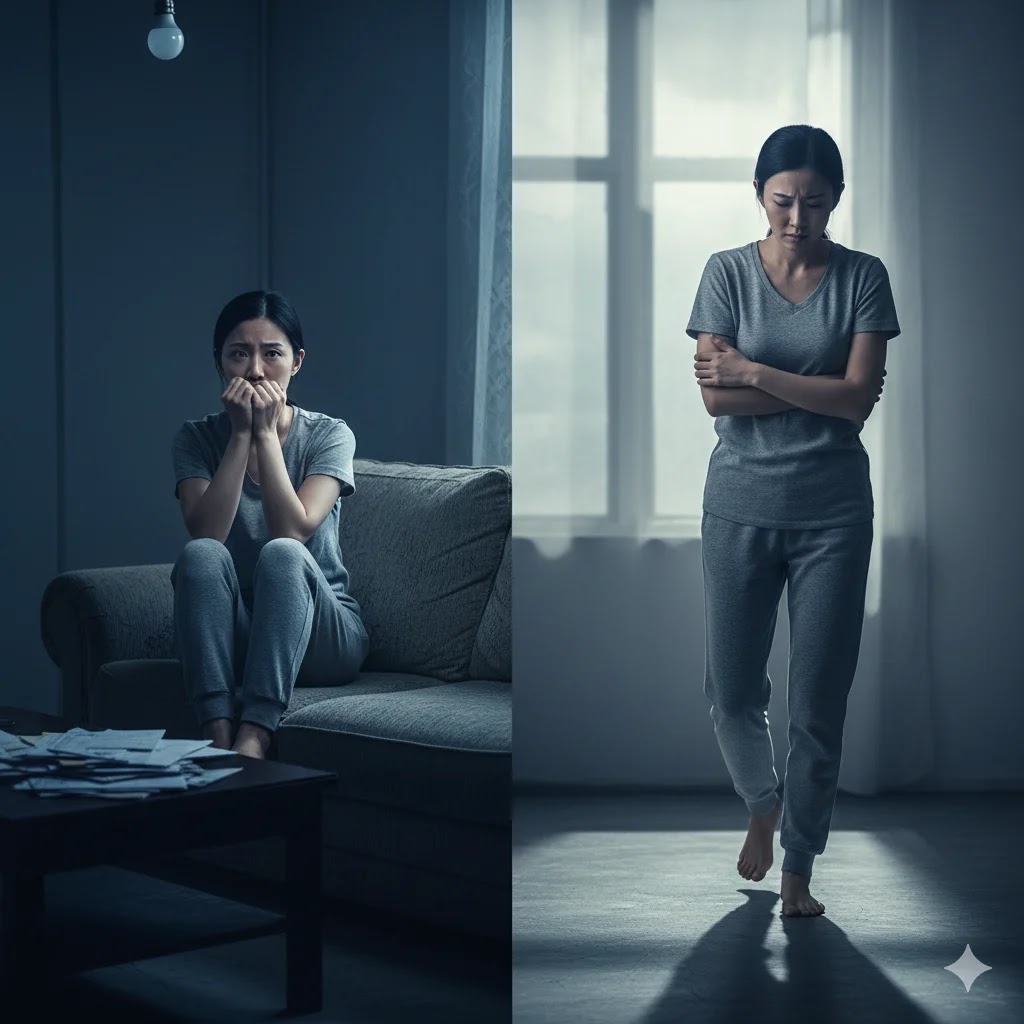 A composite image contrasting a person experiencing anxiety while sitting versus agitation while pacing.