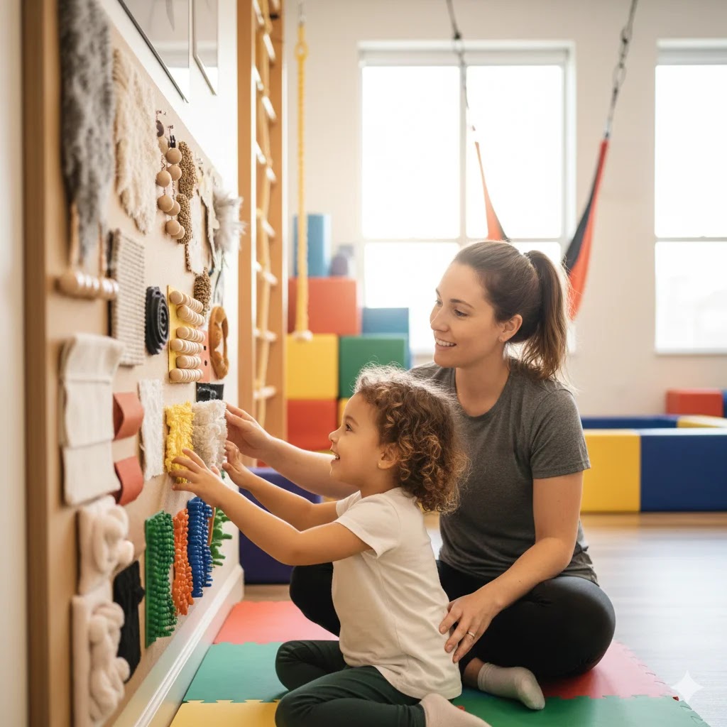 A child in a therapy gym focused on sensory tools with an occupational therapist.