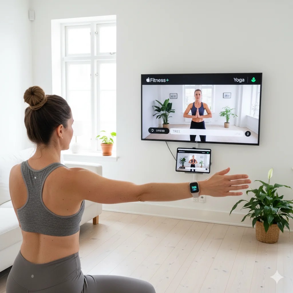 Woman with Apple Watch following an Apple Fitness+ yoga class streamed to her TV.