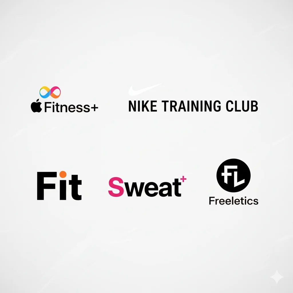 Logo grid for top fitness apps: Apple Fitness+, Nike Training Club, Fiit, Sweat, and Freeletics.