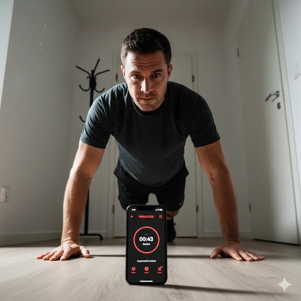 Person doing a high-intensity burpee in a small space with the Freeletics app timer visible.