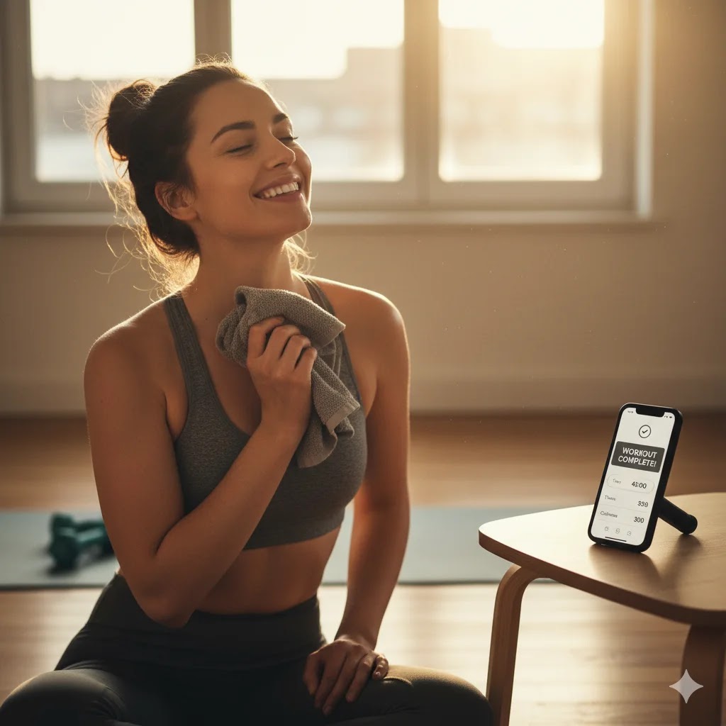 A happy and accomplished woman finishing a home workout, with her fitness app showing a completion screen.