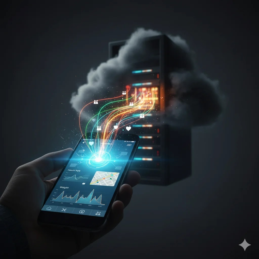 Conceptual image symbolizing fitness app data privacy, with user data flowing from a phone to a cloud server.