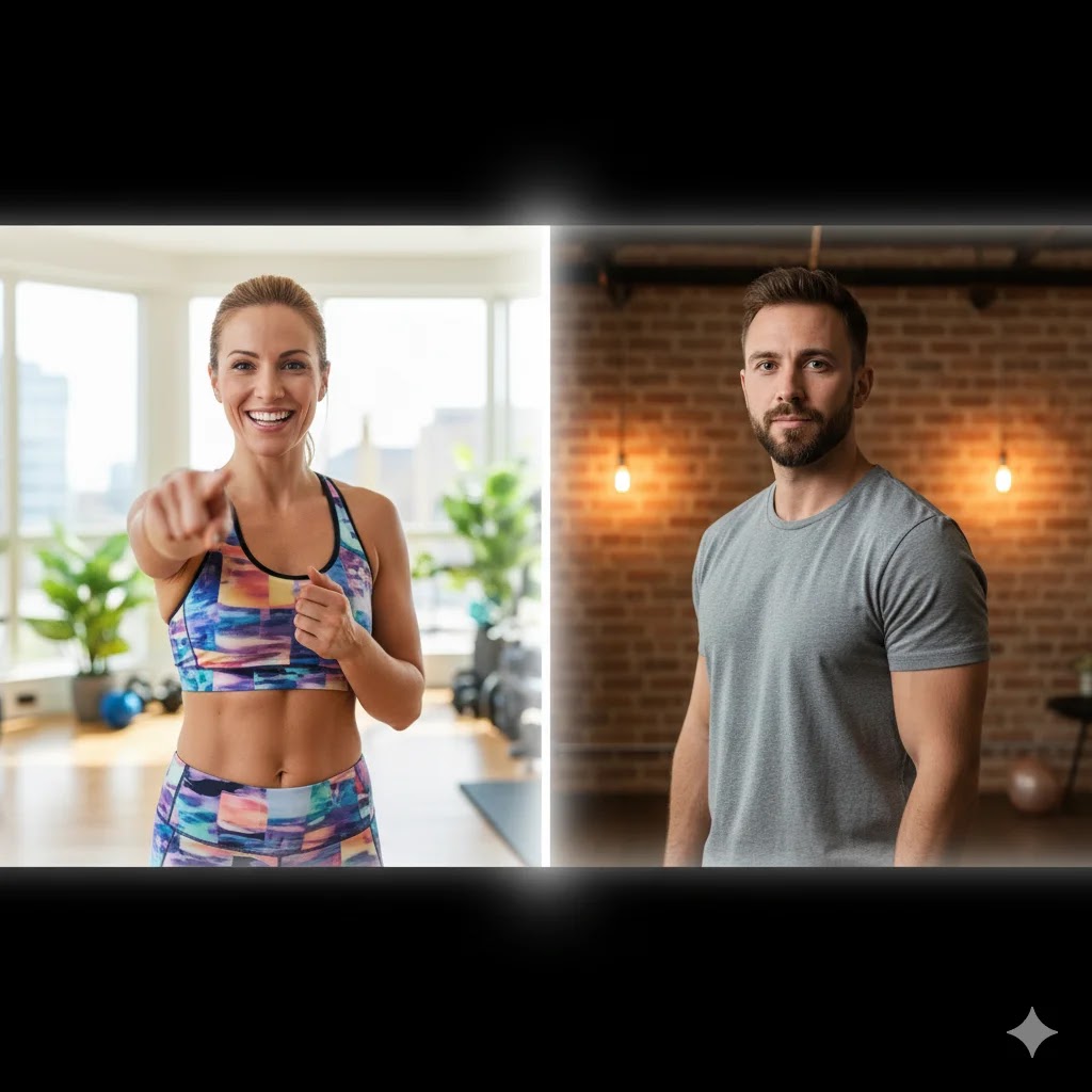 Split-screen photo comparing a US fitness trainer and a UK fitness trainer leading home workouts.