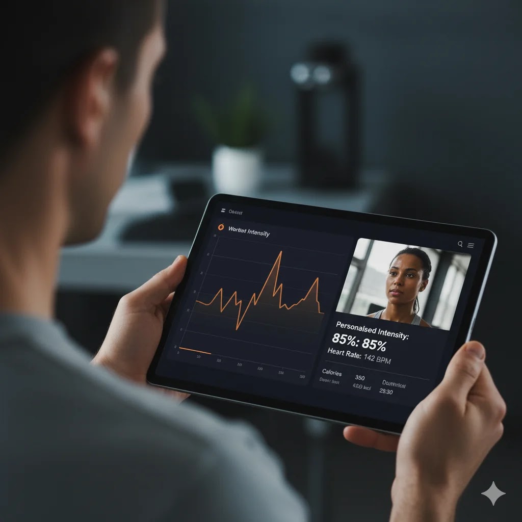 Close-up of a tablet showing a personalized fitness app interface with live user stats and heart rate data.