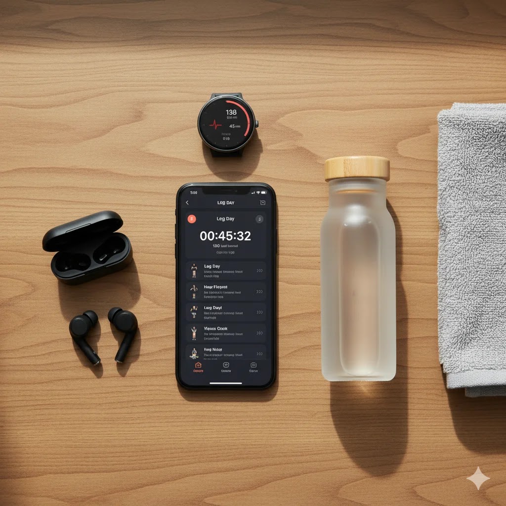 Top-down flat lay of home workout essentials: a smartphone with a fitness app, smartwatch, headphones, and water bottle.