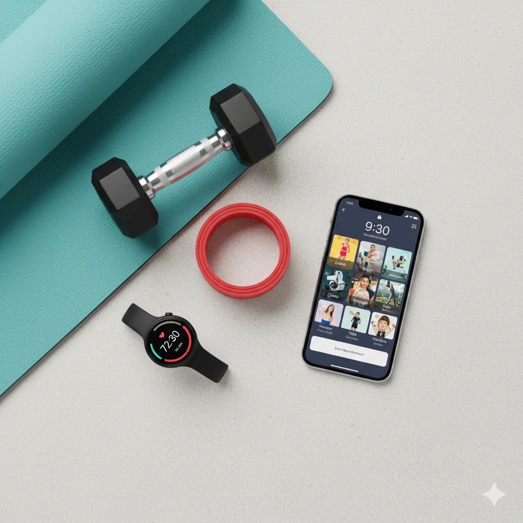 A starter kit for home fitness, featuring a yoga mat, dumbbell, resistance band, and fitness app on a phone.