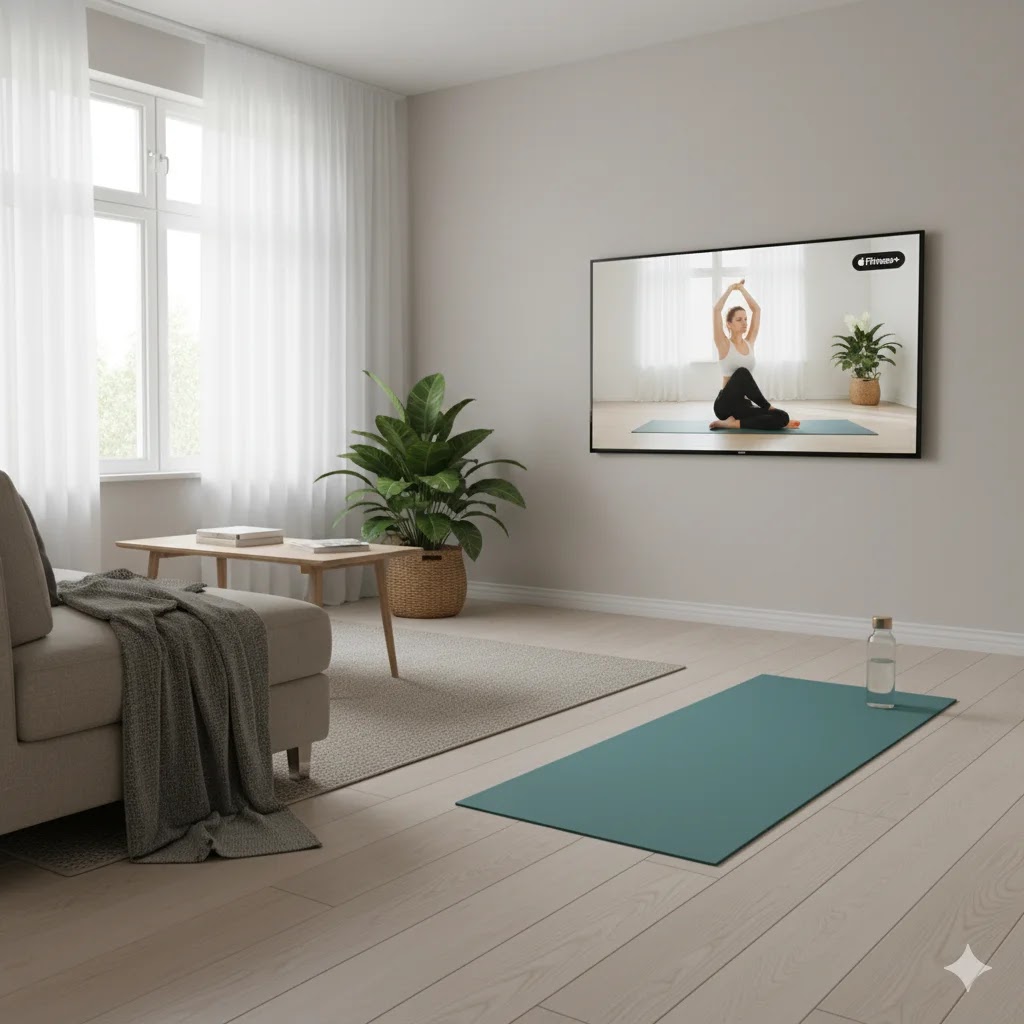 A large TV screen displaying a yoga app for an immersive home workout experience in a lounge.