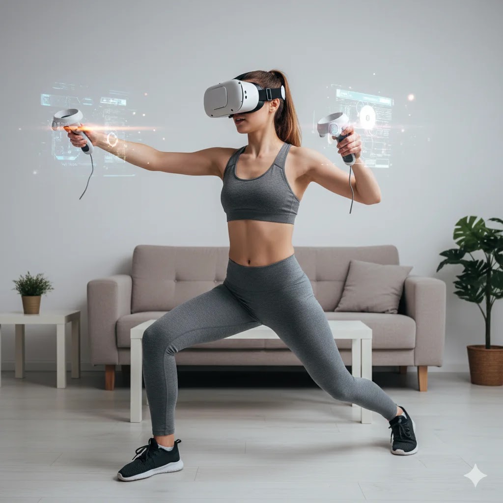A person wearing a VR headset engaged in an immersive virtual reality fitness workout at home.