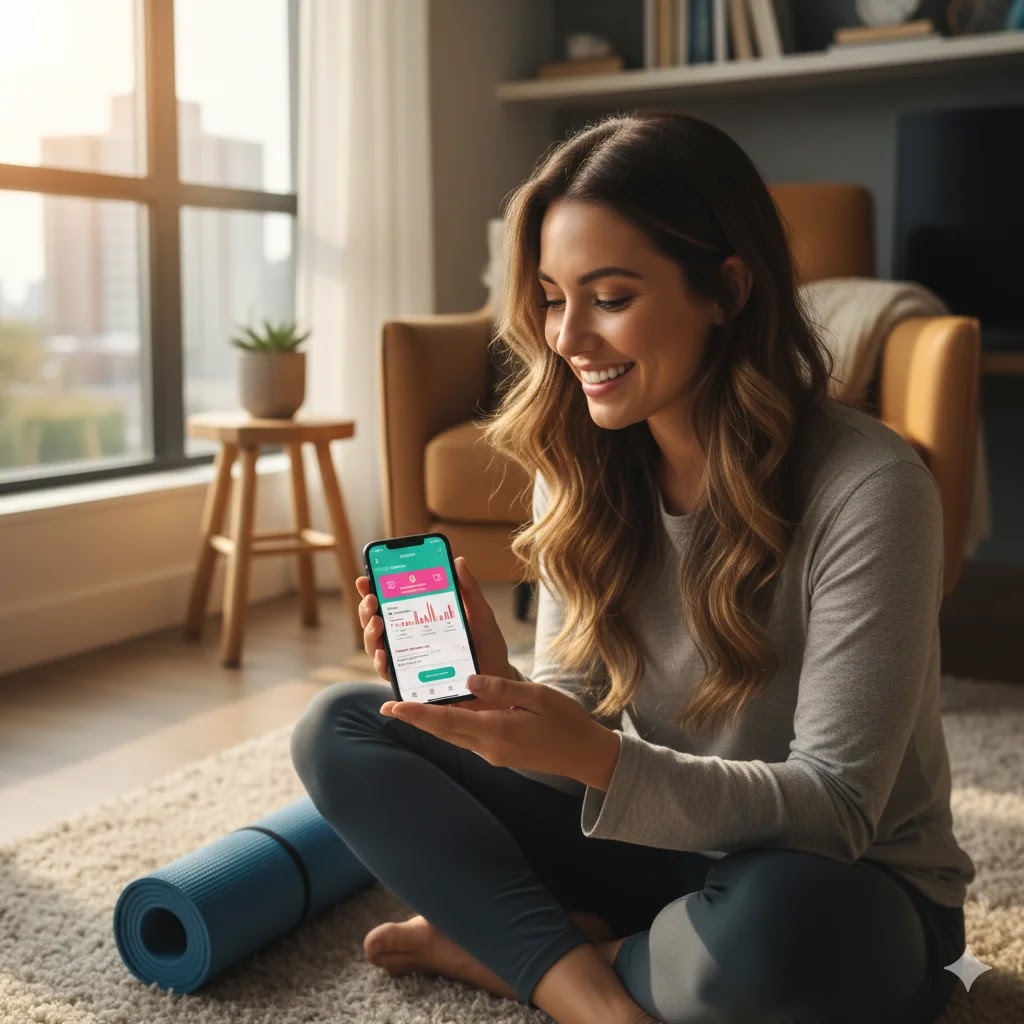 A smiling woman planning her home fitness routine with a fitness app on her phone in a cozy apartment.