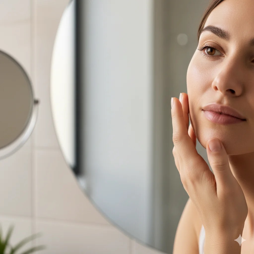 A person assessing their skin type by gently touching their cheek while looking in a bathroom mirror.