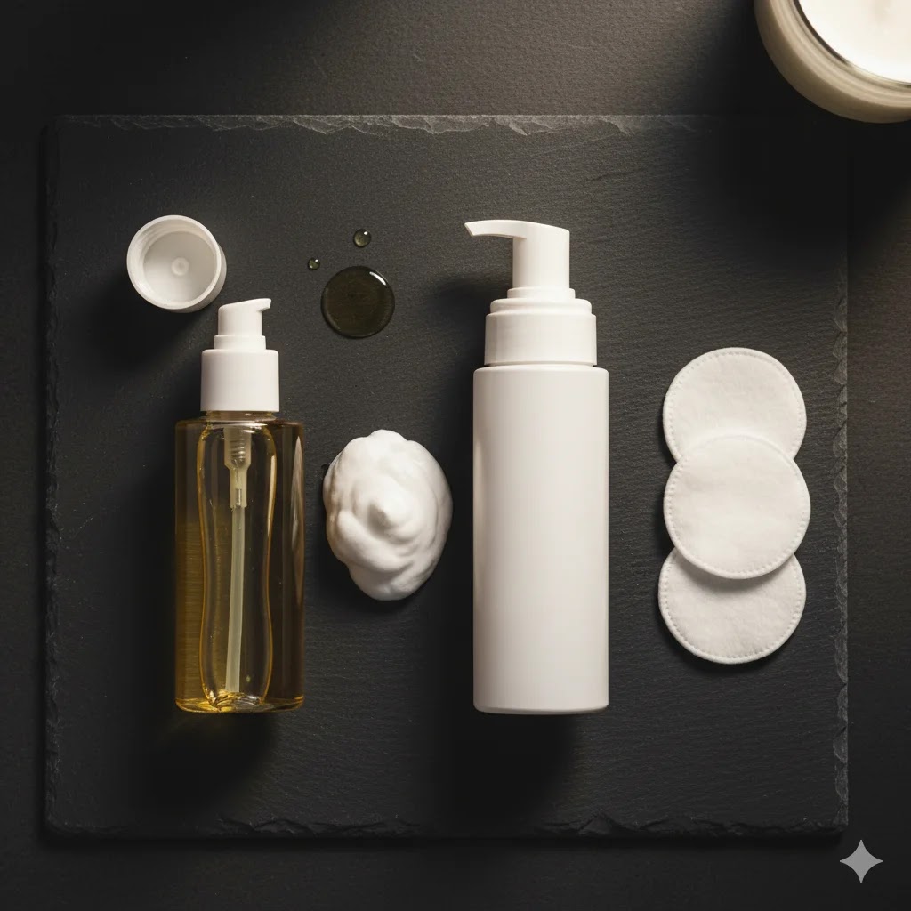 A flat lay of double cleansing products, featuring a cleansing oil and a water-based facial cleanser.
