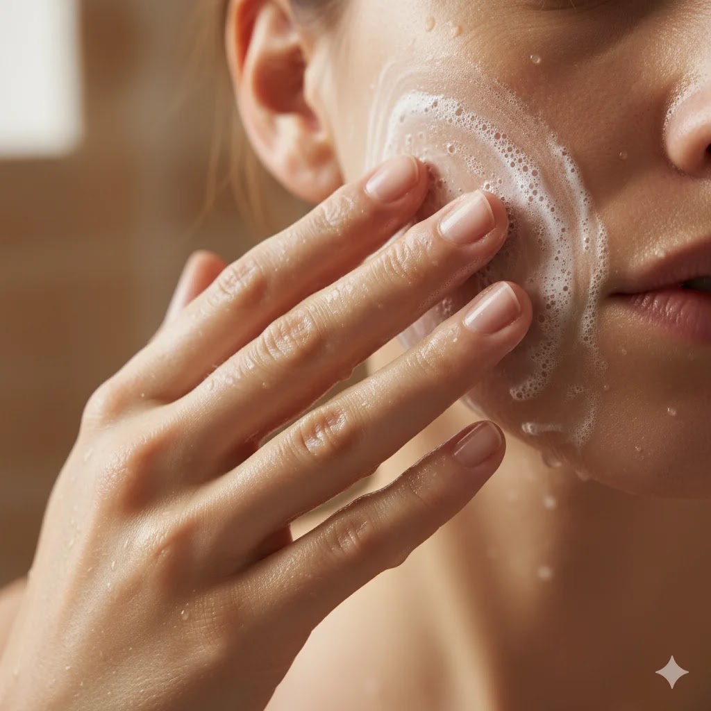 Close-up of hands massaging a creamy facial cleanser into skin to remove impurities and oil.