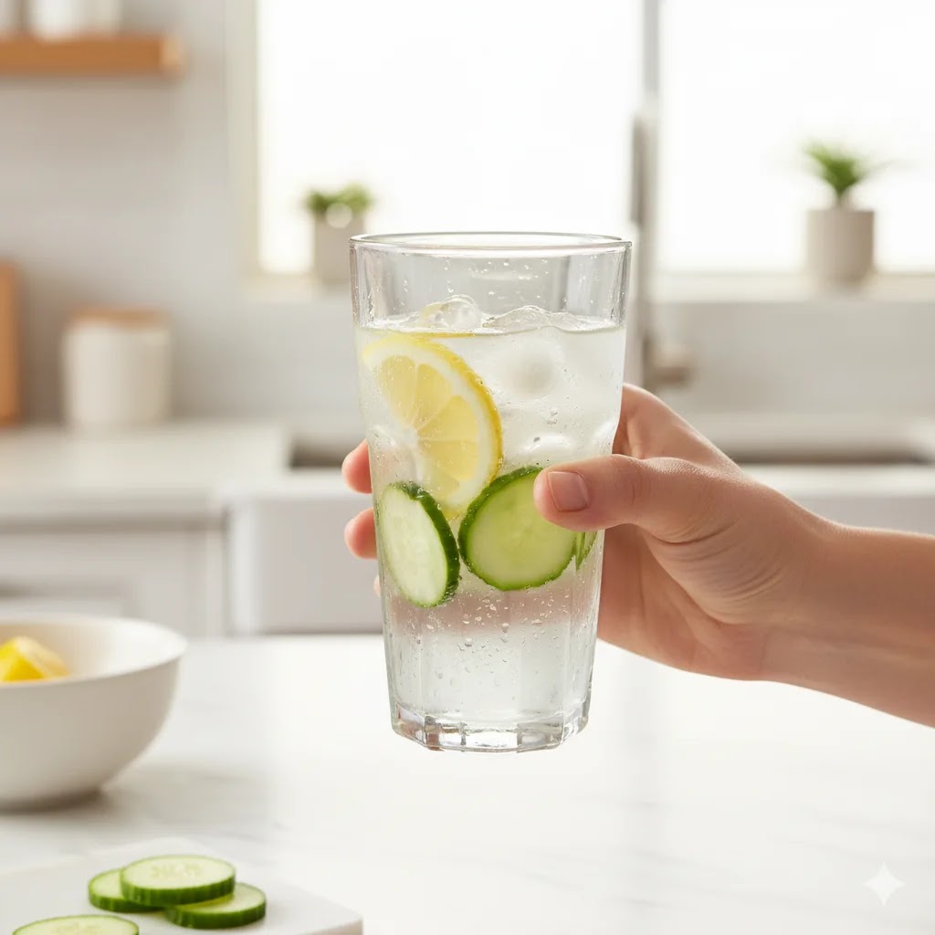 A hand holding a glass of cold water with lemon and cucumber, representing the importance of hydration for skin health.