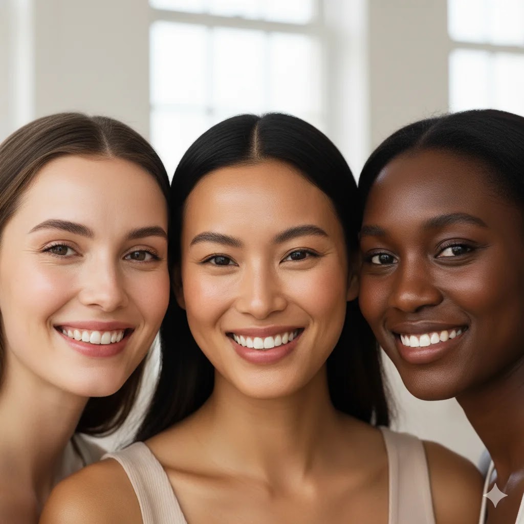 Three diverse women with different skin tones smiling, showcasing clear and radiant healthy skin. Daily Skincare Routine
