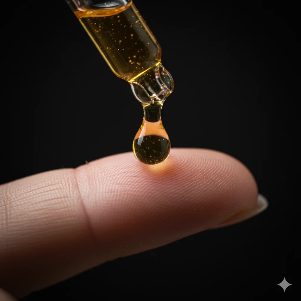 Extreme close-up of a glass dropper dispensing a glistening serum onto a fingertip for evening treatment.