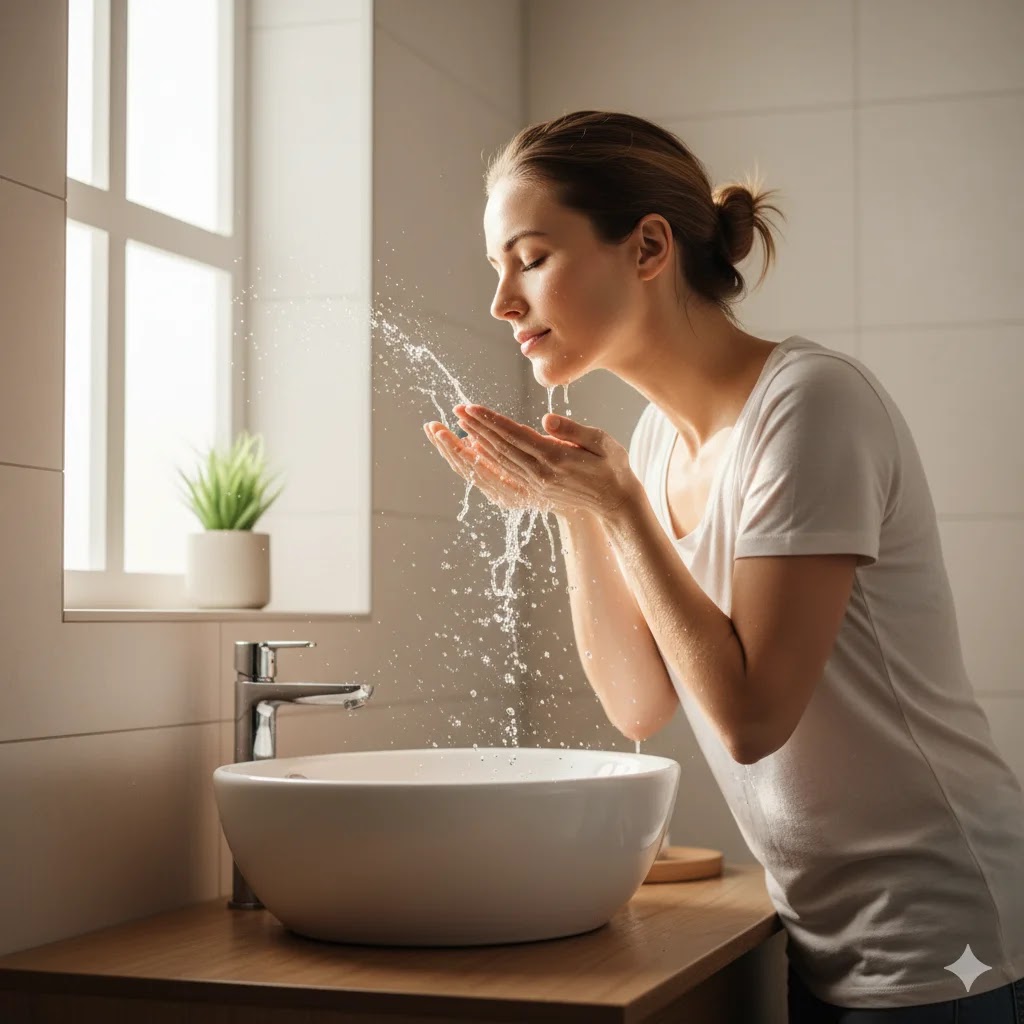A woman gently splashing water on her face at a bathroom sink during her morning skincare routine.