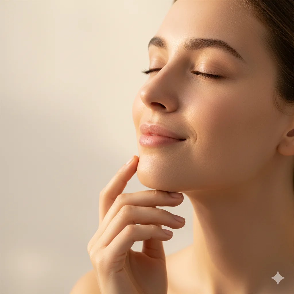 Close-up portrait of a person with their eyes closed, touching their chin with a content smile, showcasing healthy skin.