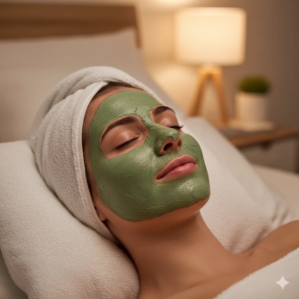 A person relaxing with a green clay face mask applied evenly, indulging in a weekly skincare treatment.