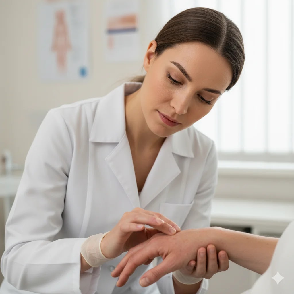 A dermatologist professionally examining a patient's hand with severe eczema, indicating when to seek medical skin help.