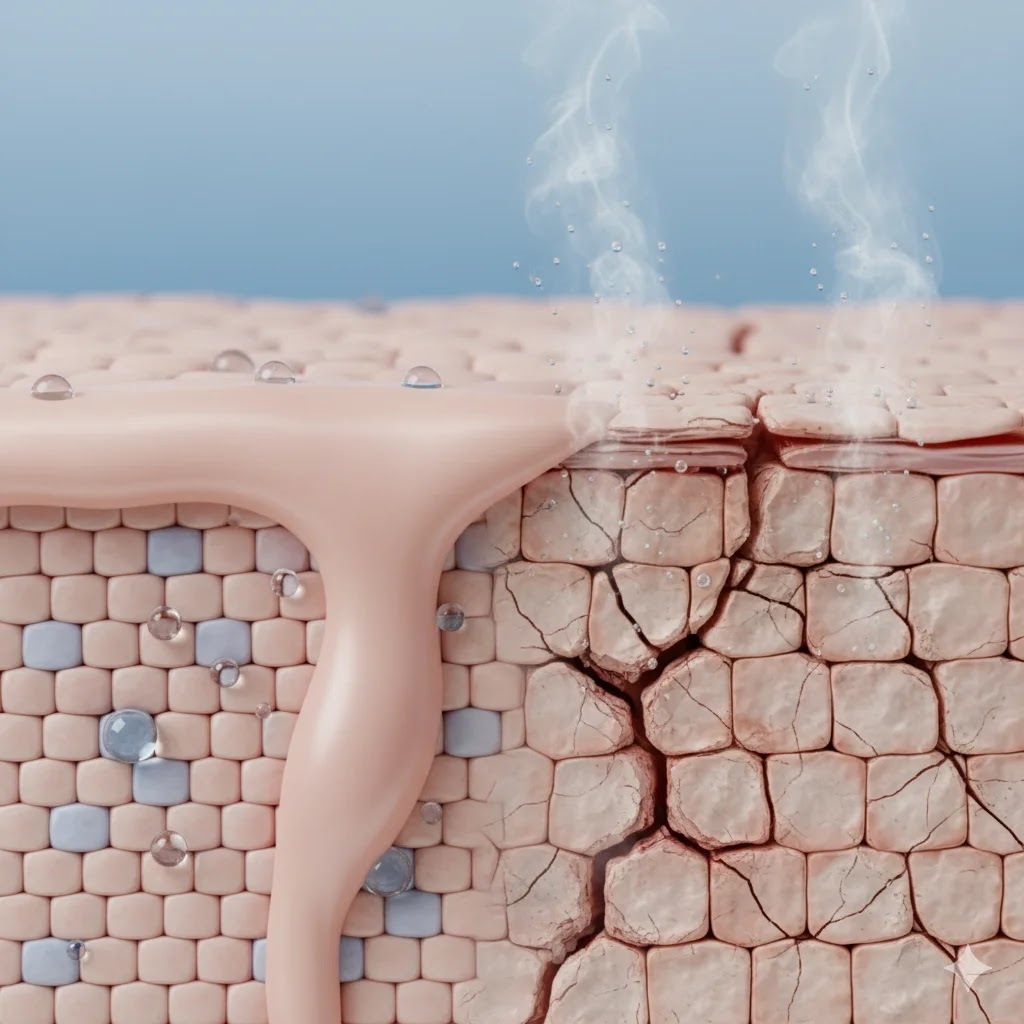 Macro diagram showing a healthy skin barrier versus a damaged, cracked winter skin barrier losing moisture.