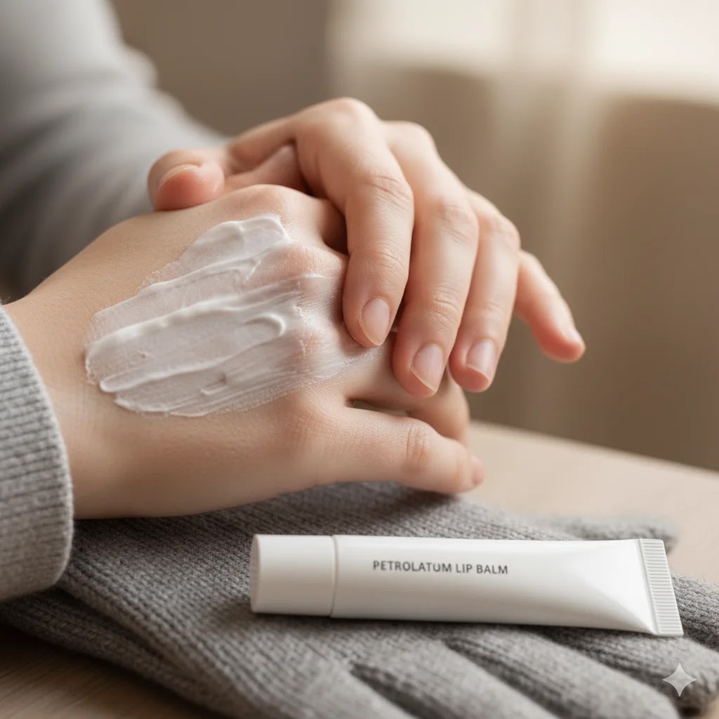 Close-up of applying rich hand cream and a tube of lip balm with winter gloves, showing care for dry hands and chapped lips.