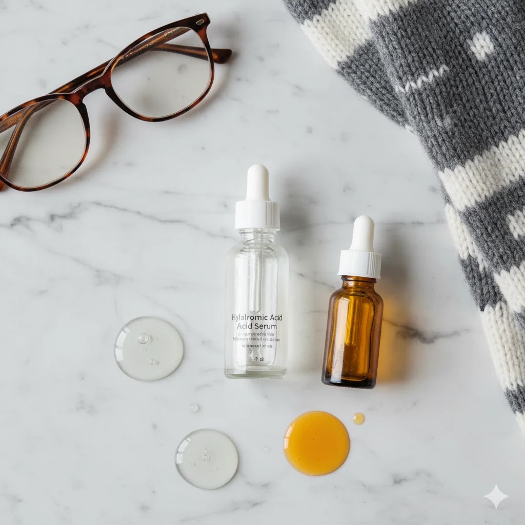 Flat lay of hyaluronic acid serum and Vitamin C serum for winter skincare, showcasing targeted treatments for hydration and protection.