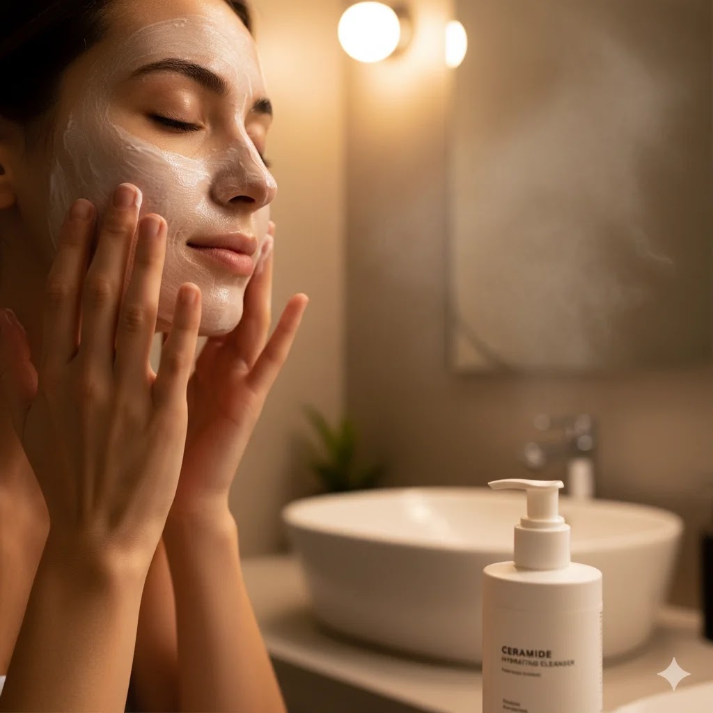 A person gently applying a creamy, hydrating facial cleanser to their skin in a bathroom, demonstrating a gentle winter cleansing routine.