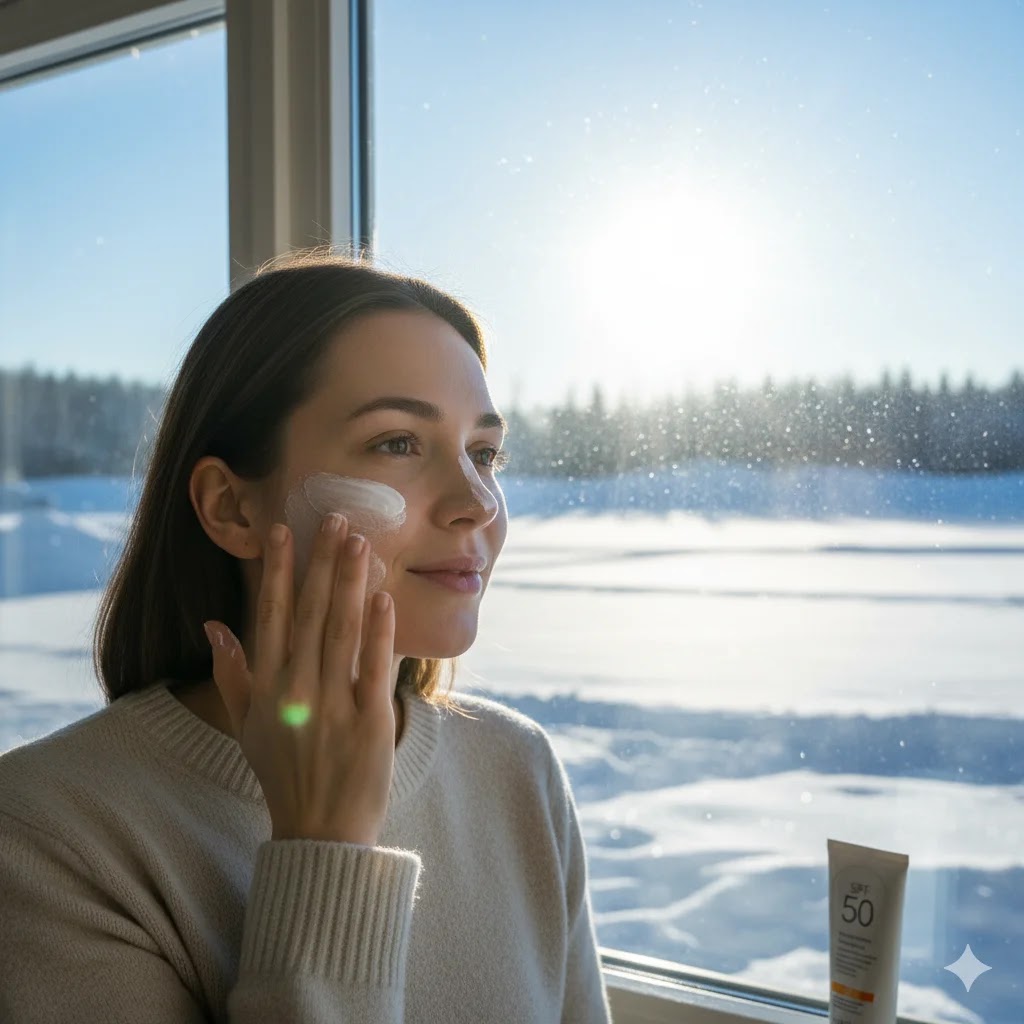 A person applying broad-spectrum SPF 50 sunscreen on their face while looking out a snowy window, emphasizing winter sun protection.