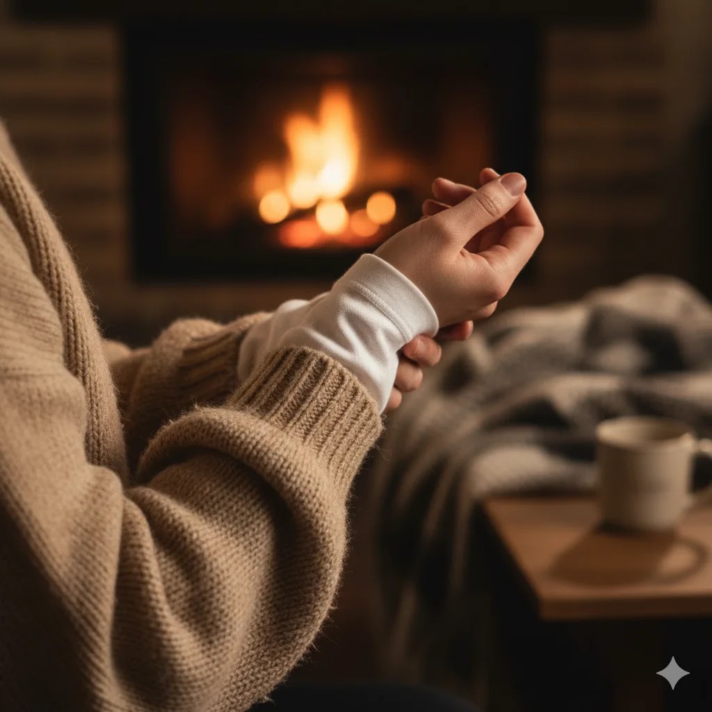 A person wearing a soft cotton layer under a wool sweater to prevent skin irritation in winter.