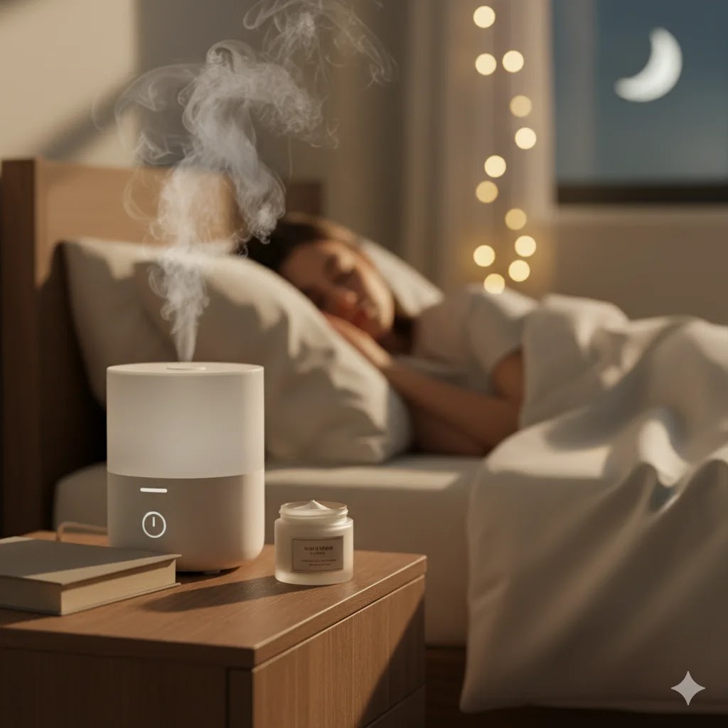 A bedroom nightstand with a humidifier misting and jar of night cream, showcasing overnight winter skincare adjustments.