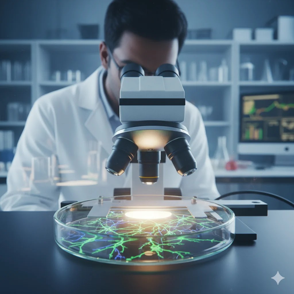 A scientist views neuron cultures in a petri dish under a microscope, representing preclinical research on Lion's Mane.