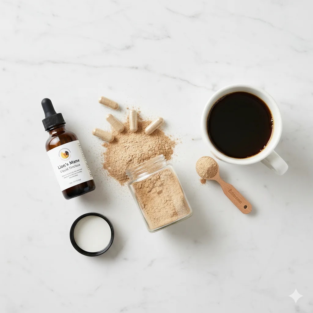 Different forms of Lion's Mane supplements: powder, capsules, tincture, and coffee in a product flat lay.