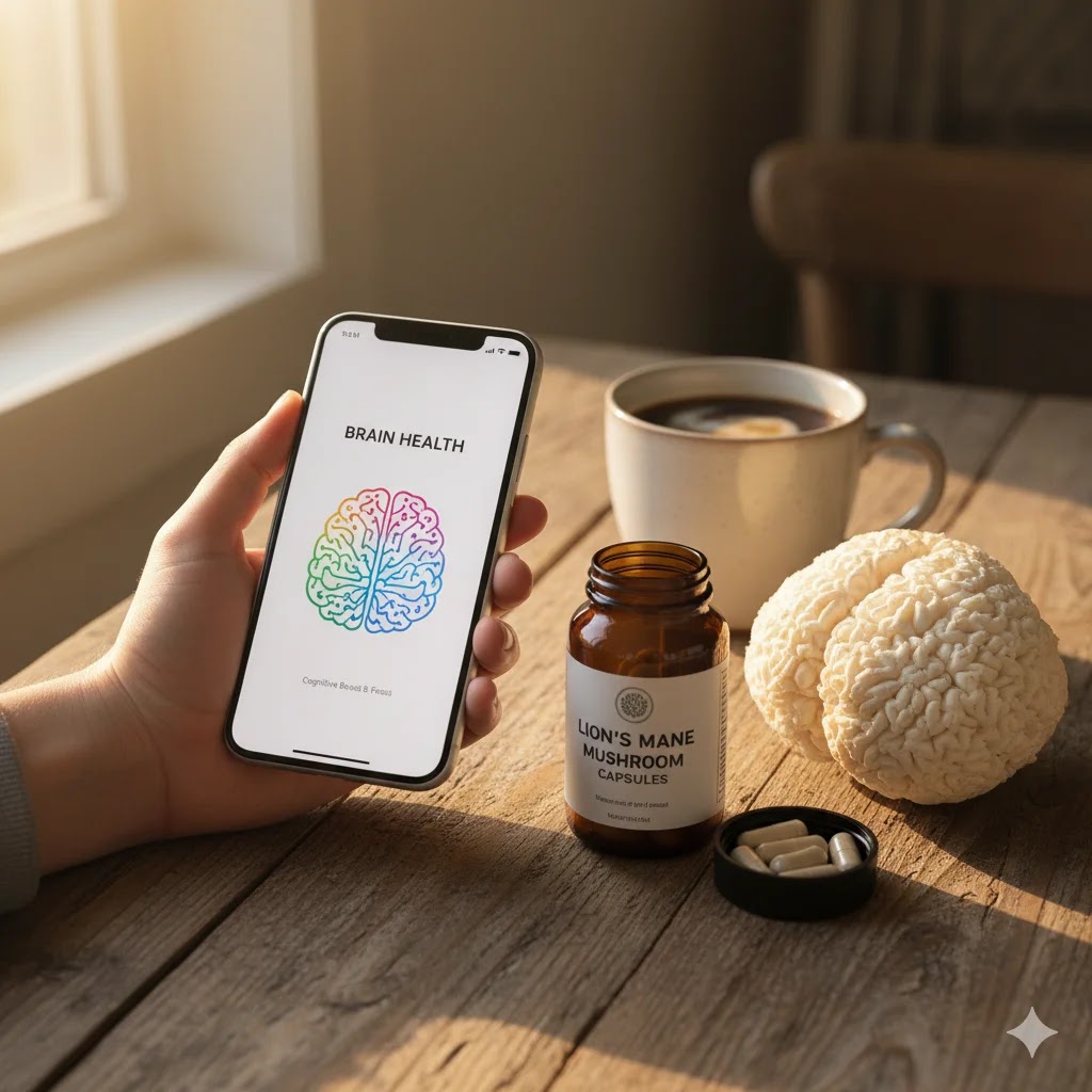 Lion's Mane mushroom supplements and a smartphone on a wooden table, highlighting modern brain health trends. boost brain power