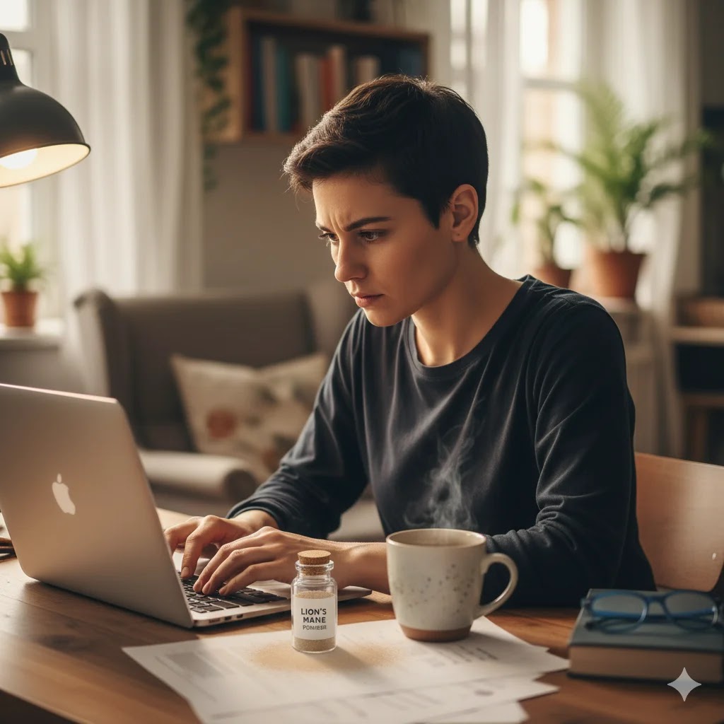 A focused professional working at a laptop with Lion's Mane powder, symbolizing enhanced concentration.