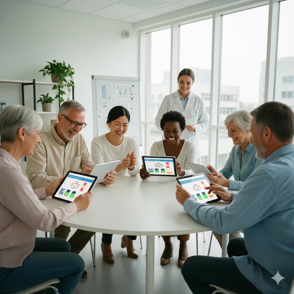 Diverse group of seniors participating in a memory study in a clinical setting.