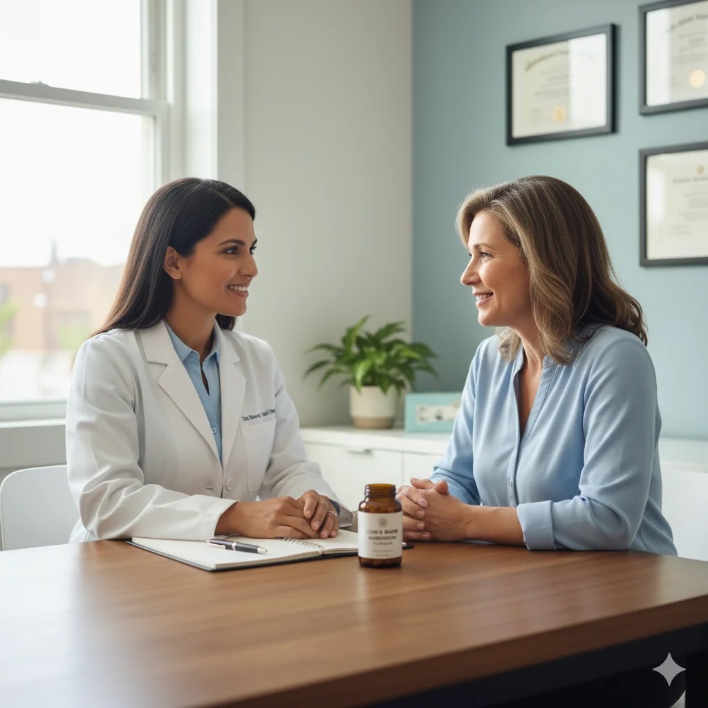 A doctor and patient discussing supplements in a clinic, emphasizing the importance of professional consultation.