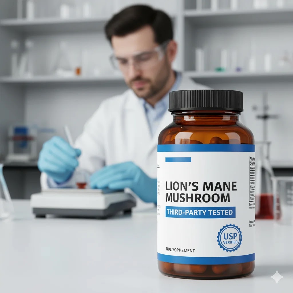 A close-up of a third-party tested Lion's Mane supplement bottle, highlighting quality and purity.