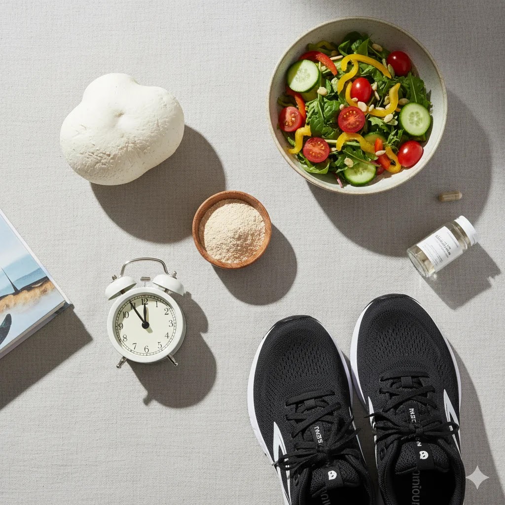 A lifestyle flat lay with Lion's Mane mushroom, running shoes, and healthy food, representing a holistic approach to brain health.