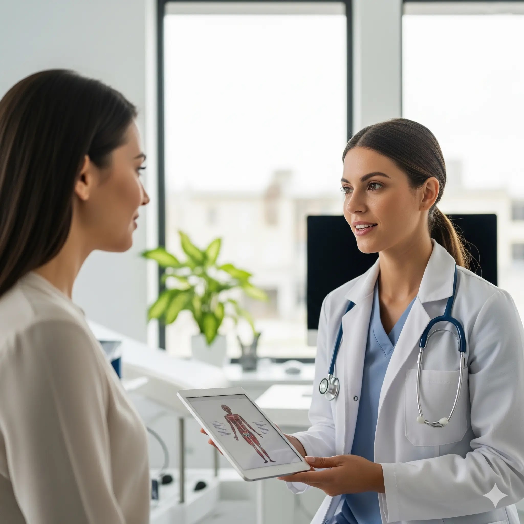 A doctor in a white coat calmly discussing a treatment plan with a female patient in a bright, modern clinic room.