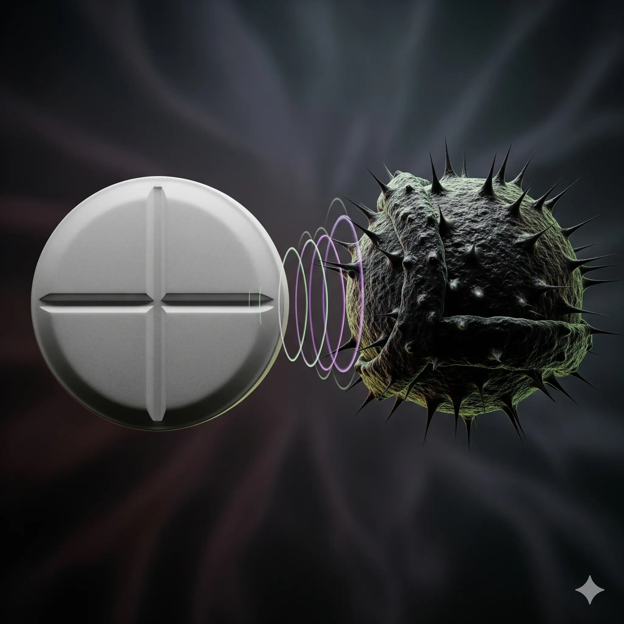 A 3D illustration concept of antimicrobial resistance, showing a fungal cell with a protective shield deflecting the effect of a drug pill.