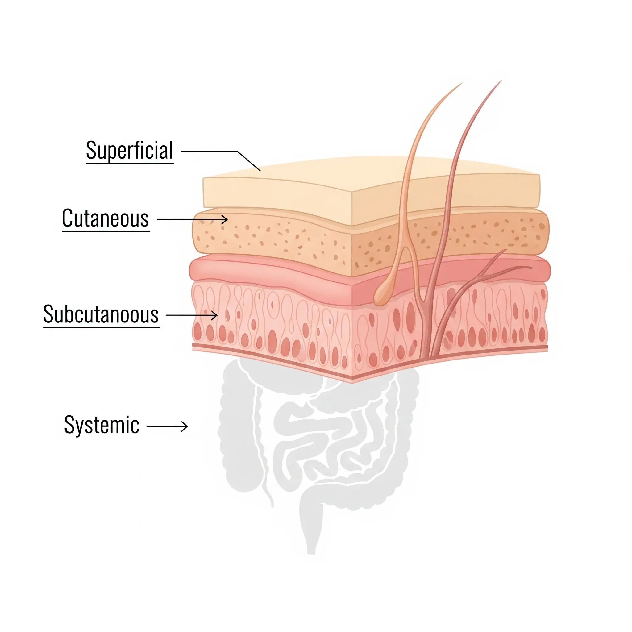 An illustrated diagram of human skin layers with labels and arrows pointing to where superficial, cutaneous, subcutaneous, and systemic fungal infections occur.