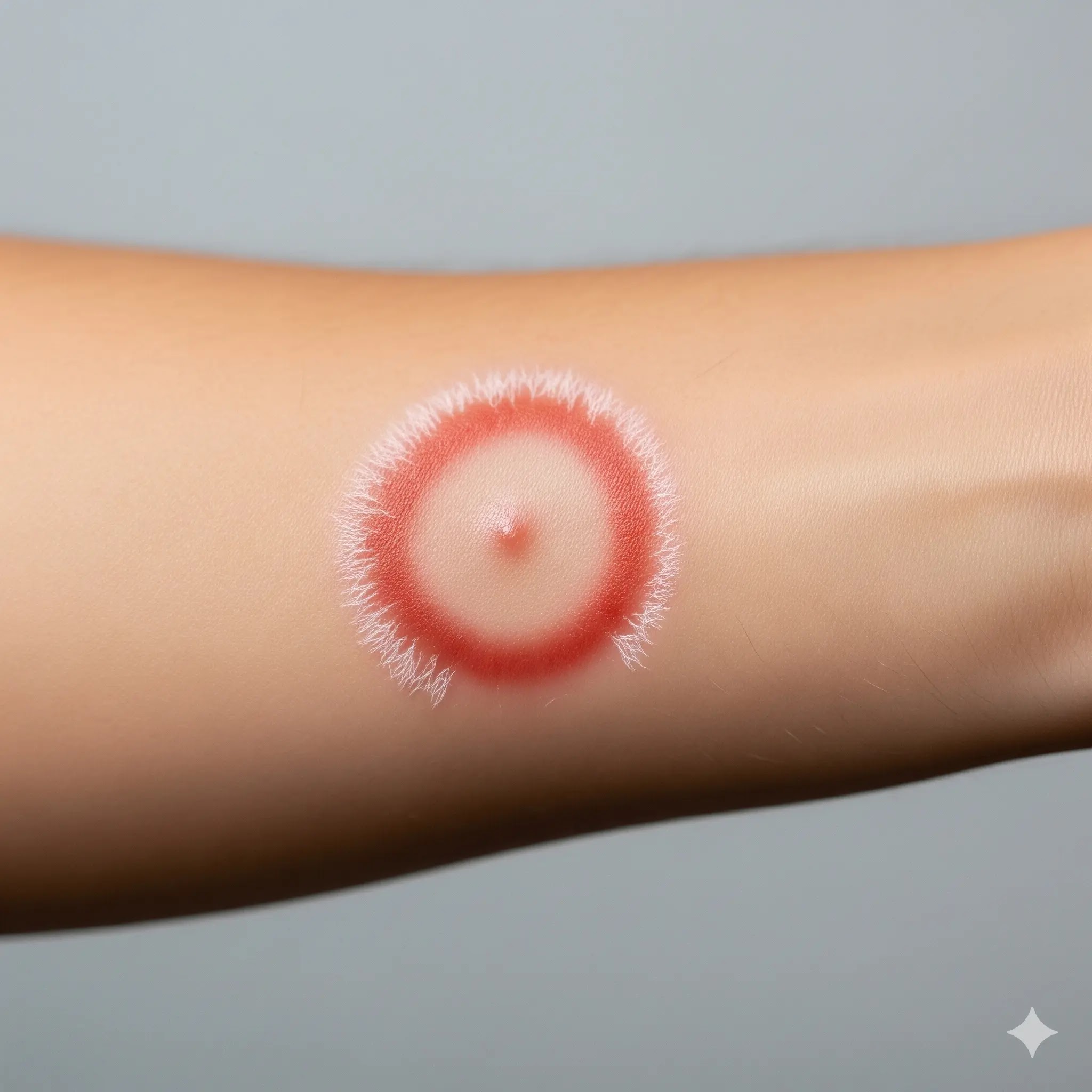 Clinical photo of a ringworm infection on a person's arm, showing a distinct circular red rash with a clearer center.