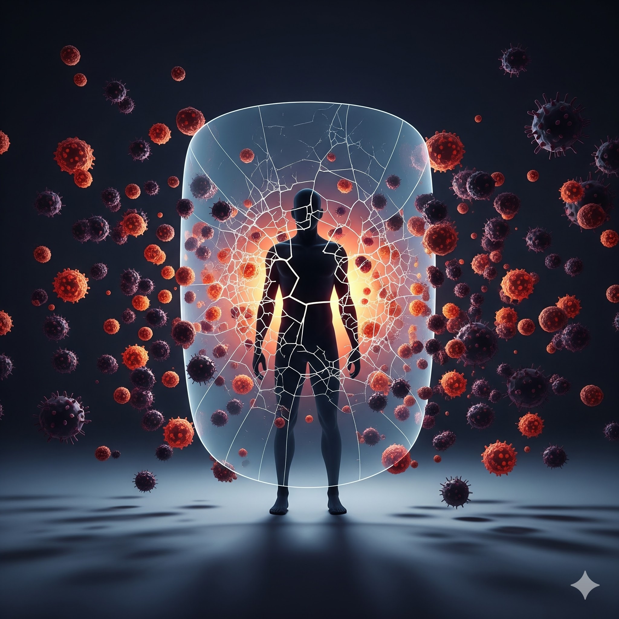 A conceptual image of a human silhouette with a cracked, shield-like barrier, representing a weakened immune system vulnerable to pathogens.